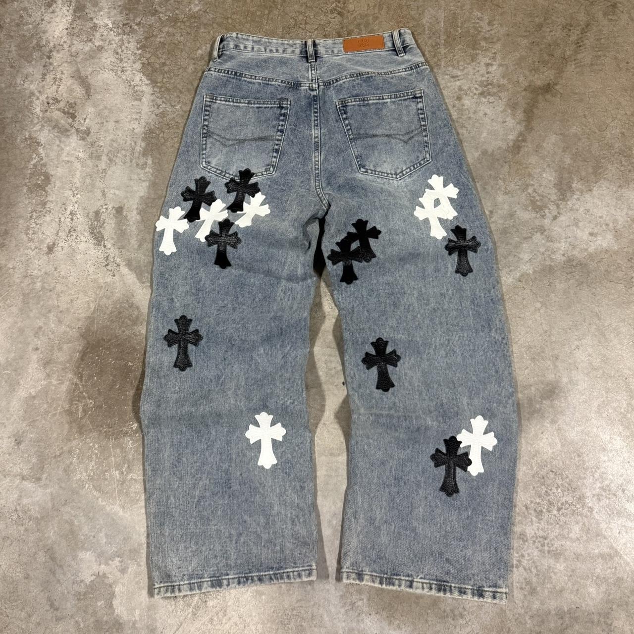 Chrome Denim Jeans with Embroidered Multi-colored Crosses